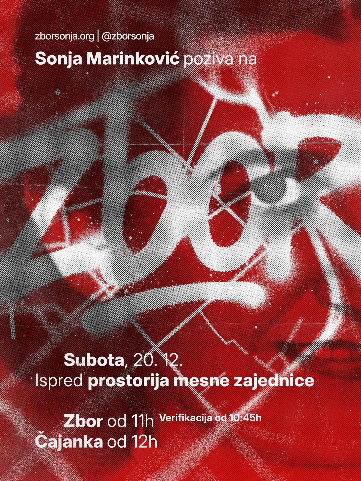Ako je tvoje prebivalište na adresi mesne zajednice Sonja Marinković, dođi na zbor i verifikuj se — time stičeš pristup zatvorenoj Viber grupi verifikovanih građana Sonje i pravo da učestvuješ u oblikovanju budućnosti našeg zbora.Ako želiš više da doprineseš i uključiš se u organizaciju, pridruži se našim radnim grupama: